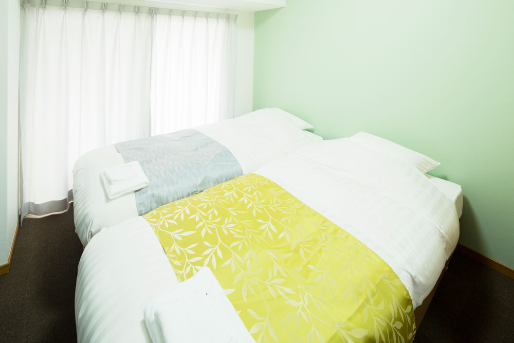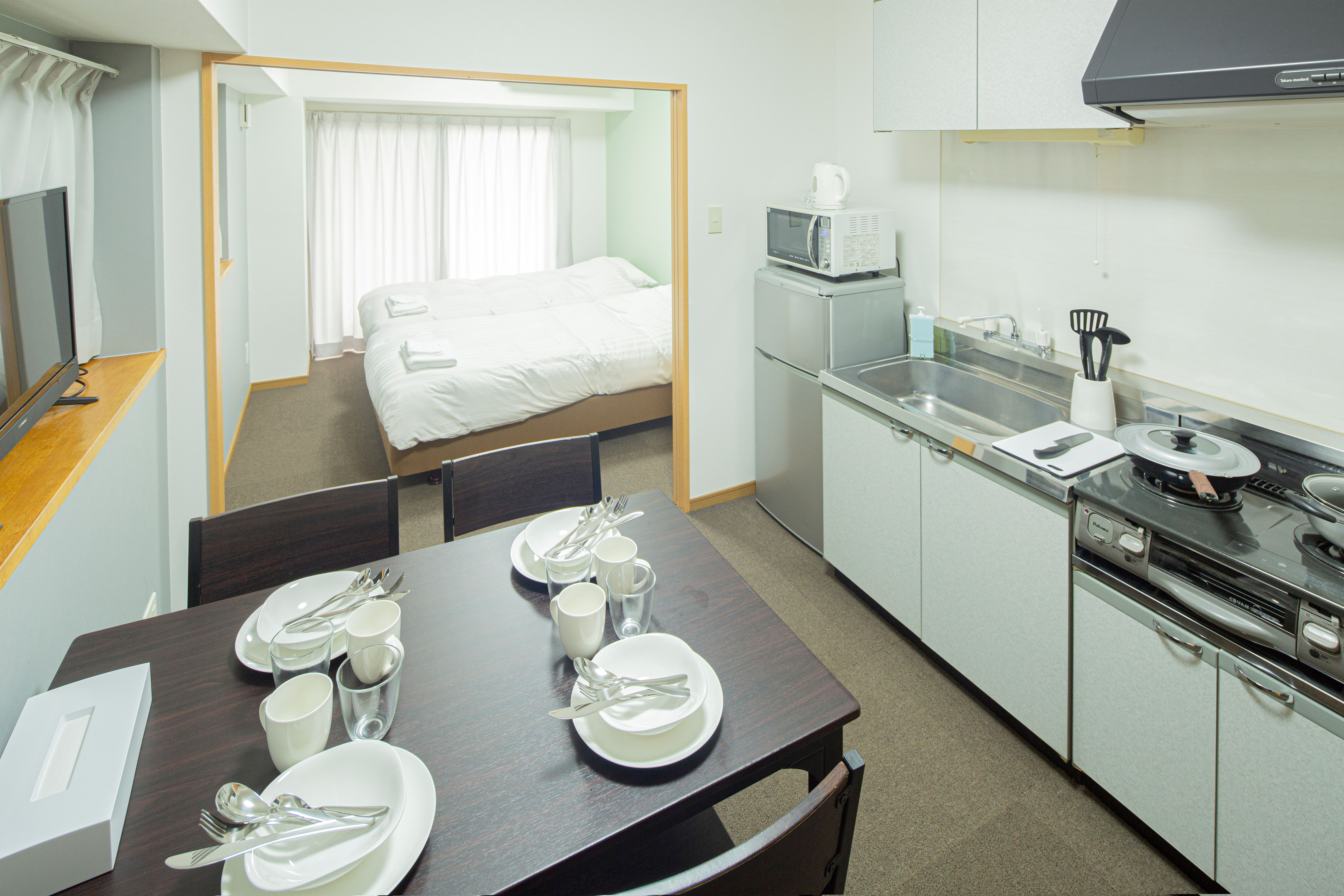 床的类型 两张单人床,一张双人被褥。 房间设备 带卫生间的浴室、电视、免费WiFi、非吸烟、厨房、餐具、洗衣机、吹风机、冰箱、电热水壶、微波炉、书桌和椅子。 房间面积 27.04㎡ / 27.09㎡(1DK)